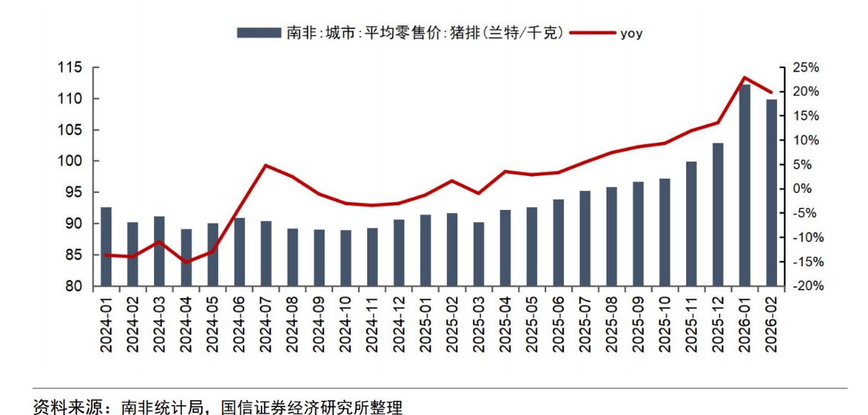 生猪板块同样受波及。2025年11月商业化猪场首现病例,仔猪死亡率高达20%,且当地暂无获批的猪用疫苗。供需严重失衡直接推高南非肉类通胀,2025年12月,南非牛排、香肠、羊肉、猪肉价格同比涨幅分别达29.4%、19.4%、15%及11.5%。