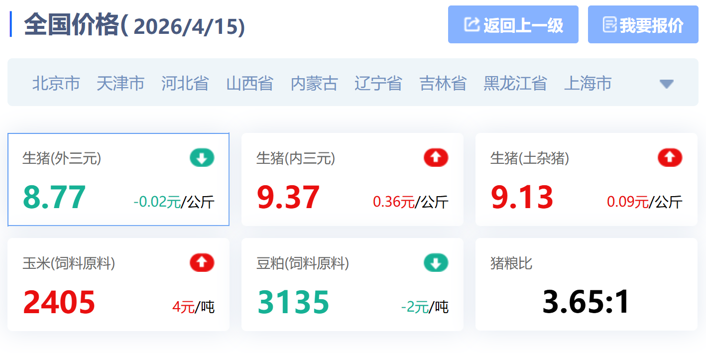 价格层面,猪价仍处深度亏损区,生长周期更长的生猪(内三元)价格较前日小幅反弹。根据中国养猪数据中心,截至2026年4月15日,全国外三元生猪价格报8.77元/公斤,较前一日下跌0.02元/公斤;内三元价格报9.37元/公斤,上涨0.36元/公斤。猪粮比已跌至3.65:1,远低于5:1的一级预警线。