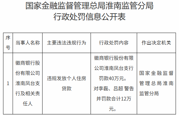 【大河财立方消息】4月15日,国家金融监督管理总局淮南监管分局披露的行政处罚信息公开表显示,因违规发放个人住房贷款,徽商银行股份有限公司淮南凤台支行被罚40万元。