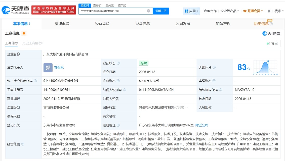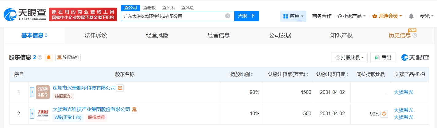 每经AI快讯,天眼查App显示,近日,广东大族汉盛环境科技有限公司成立,法定代表人为郭召永,注册资本5000万元人民币,经营范围包括制冷、空调设备销售,机械设备研发,节能管理服务等,由大族激光(002008)及旗下深圳市汉盛制冷科技有限公司共同持股。