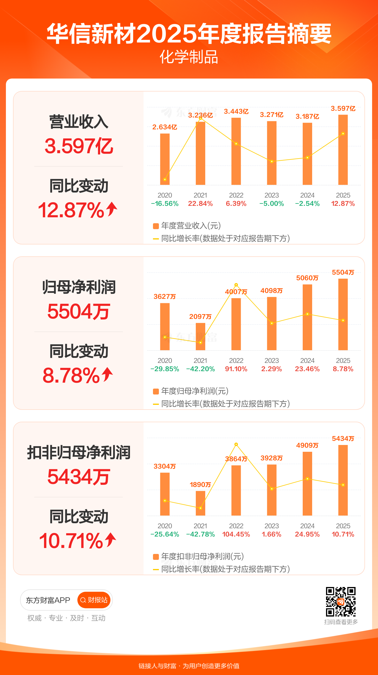 华信新材4月16日发布2025年年报显示,公司全年实现营业收入3.60亿元,同比增长12.87%;归母净利润5504.05万元,同比增长8.78%;扣非归母净利润5434.30万元,同比增长10.71%。