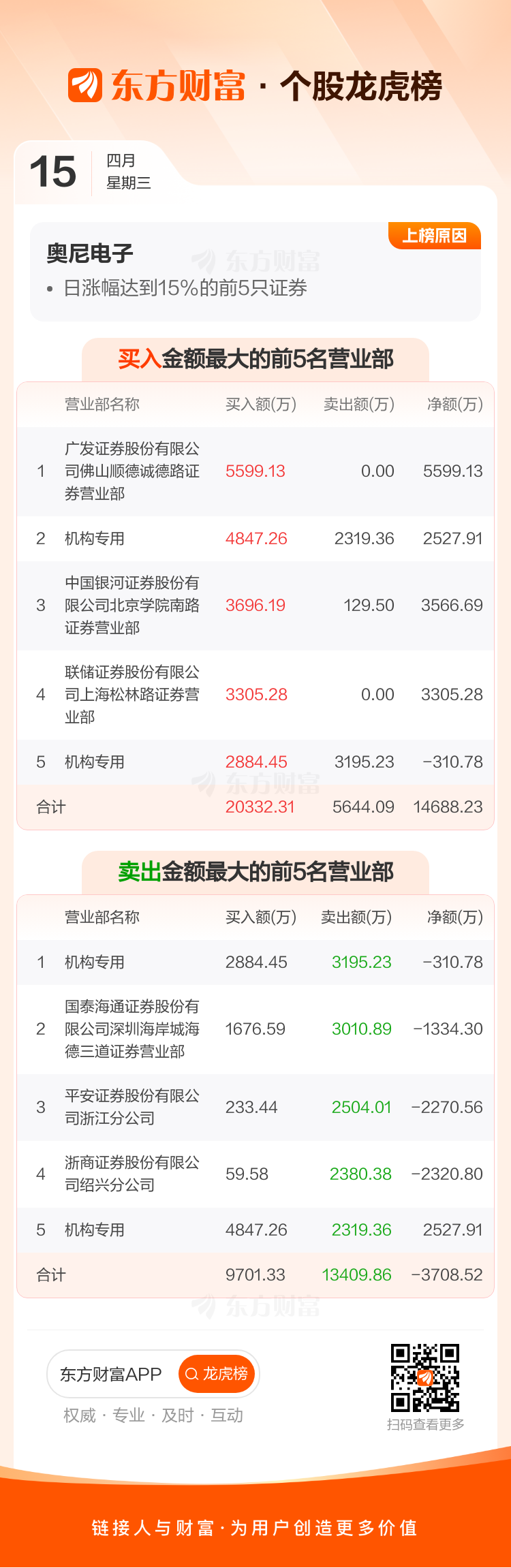 交易所2026年4月15日公布的交易公开信息显示,奥尼电子因成为日涨幅达到15%的前5只证券上榜。奥尼电子当日收报86.39元,涨跌幅20.00%,偏离值20.00%,换手率11.91%,成交额11.39亿。