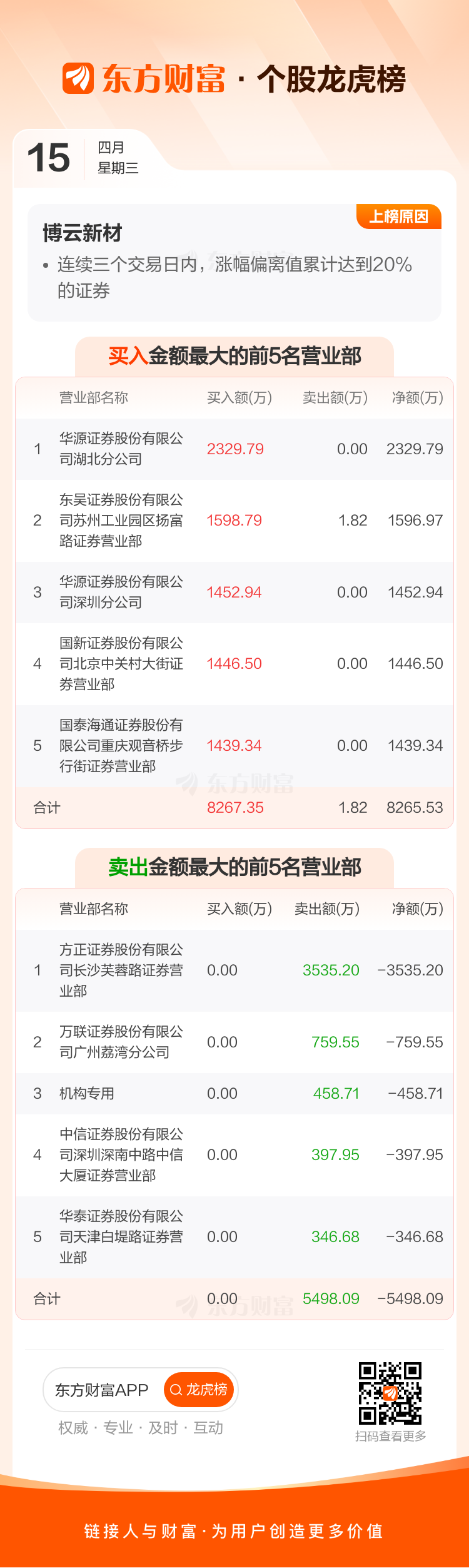 交易所2026年4月15日公布的交易公开信息显示,博云新材因成为连续三个交易日内,涨幅偏离值累计达到20%的证券上榜。博云新材当日收报14.62元,涨跌幅10.01%,换手率1.71%,成交额1.43亿。异常期间4月14日至4月15日,期间涨幅21.03%,累计偏离值20.32%,区间成交额2.79亿。