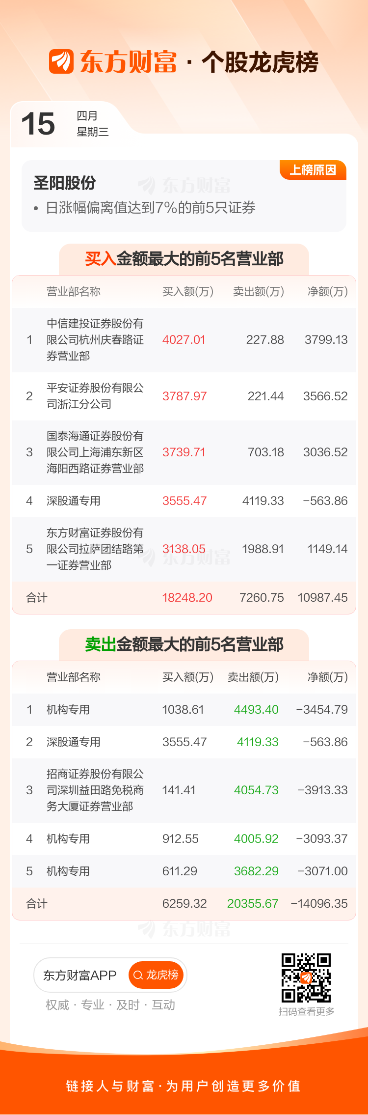 交易所2026年4月15日公布的交易公开信息显示,圣阳股份因成为日涨幅偏离值达到7%的前5只证券、连续三个交易日内,涨幅偏离值累计达到20%的证券上榜。圣阳股份当日收报25.27元,涨跌幅10.01%,偏离值10.71%,换手率23.86%,成交额27.08亿。异常期间4月14日至4月15日,期间涨幅21.02%,累计偏离值20.32%,区间成交额66.35亿。