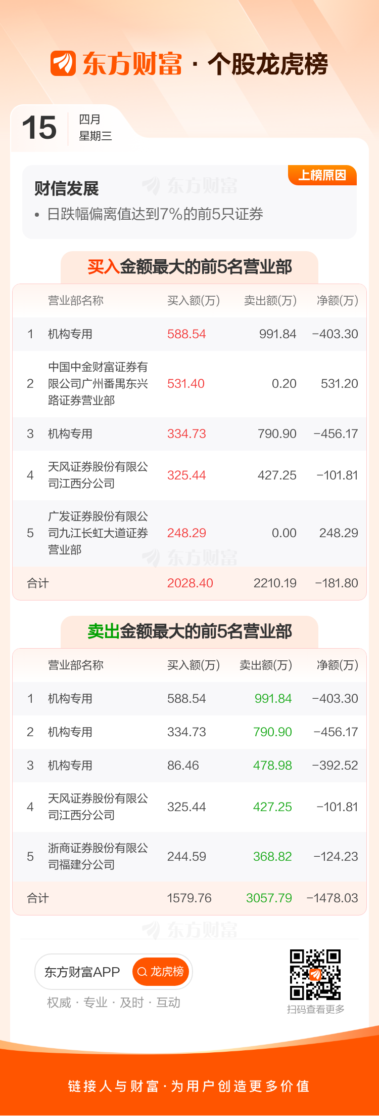 交易所2026年4月15日公布的交易公开信息显示,财信发展因成为日跌幅偏离值达到7%的前5只证券上榜。财信发展当日收报1.88元,涨跌幅-10.05%,偏离值-9.29%,换手率8.64%,成交额1.75亿。