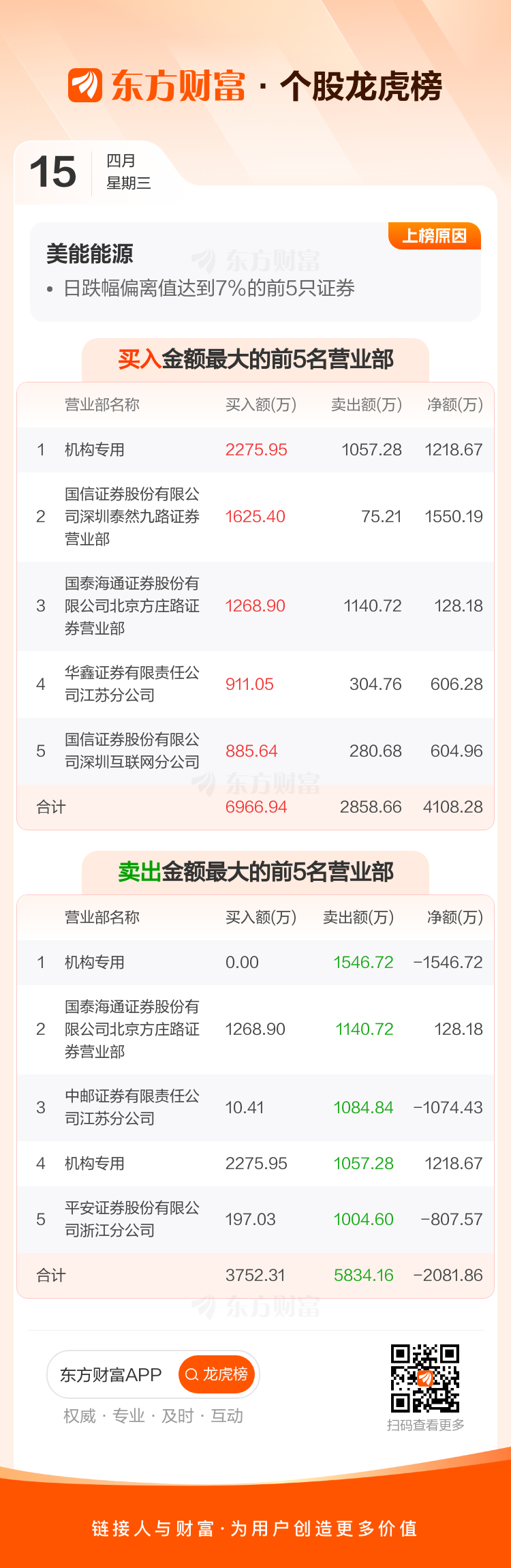 交易所2026年4月15日公布的交易公开信息显示,美能能源因成为日跌幅偏离值达到7%的前5只证券上榜。美能能源当日收报16.69元,涨跌幅-9.98%,偏离值-9.29%,换手率17.54%,成交额6.70亿。