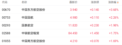 截至收盘,中国东方航空股份(00670.HK)涨3.68%,中国国航(00753.HK)涨2.26%,国泰航空(00293.HK)涨1.98%。