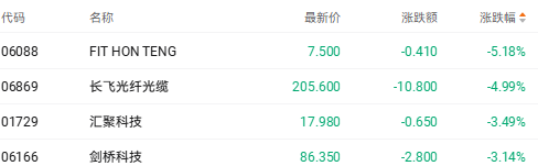 截至收盘,长飞光纤光缆(06869.HK)跌4.99%,汇聚科技(01729.HK)跌3.49%,剑桥科技(06166.HK)跌3.14%。