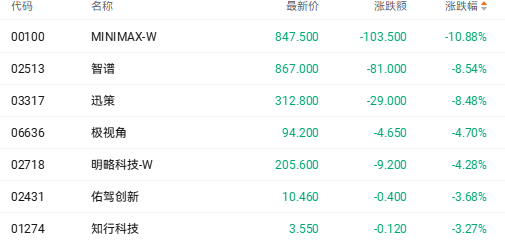 同样AI应用股也出现调整。截至收盘,MINIMAX-W(00100.HK)跌10.88%,智谱(02513.HK)跌8.54%,迅策(03317.HK)跌8.48%。