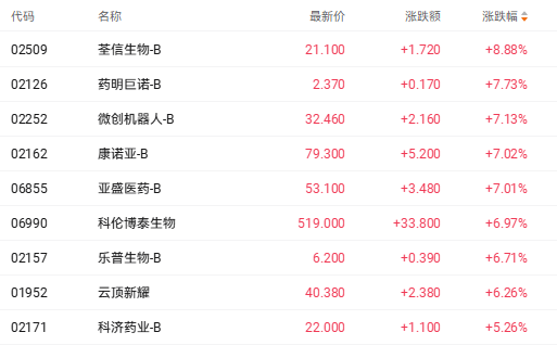 截至收盘,药明巨诺-B(02126.HK)涨7.73%,康诺亚-B(02162.HK)涨7.02%,亚盛医药-B(06855.HK)涨7.01%。