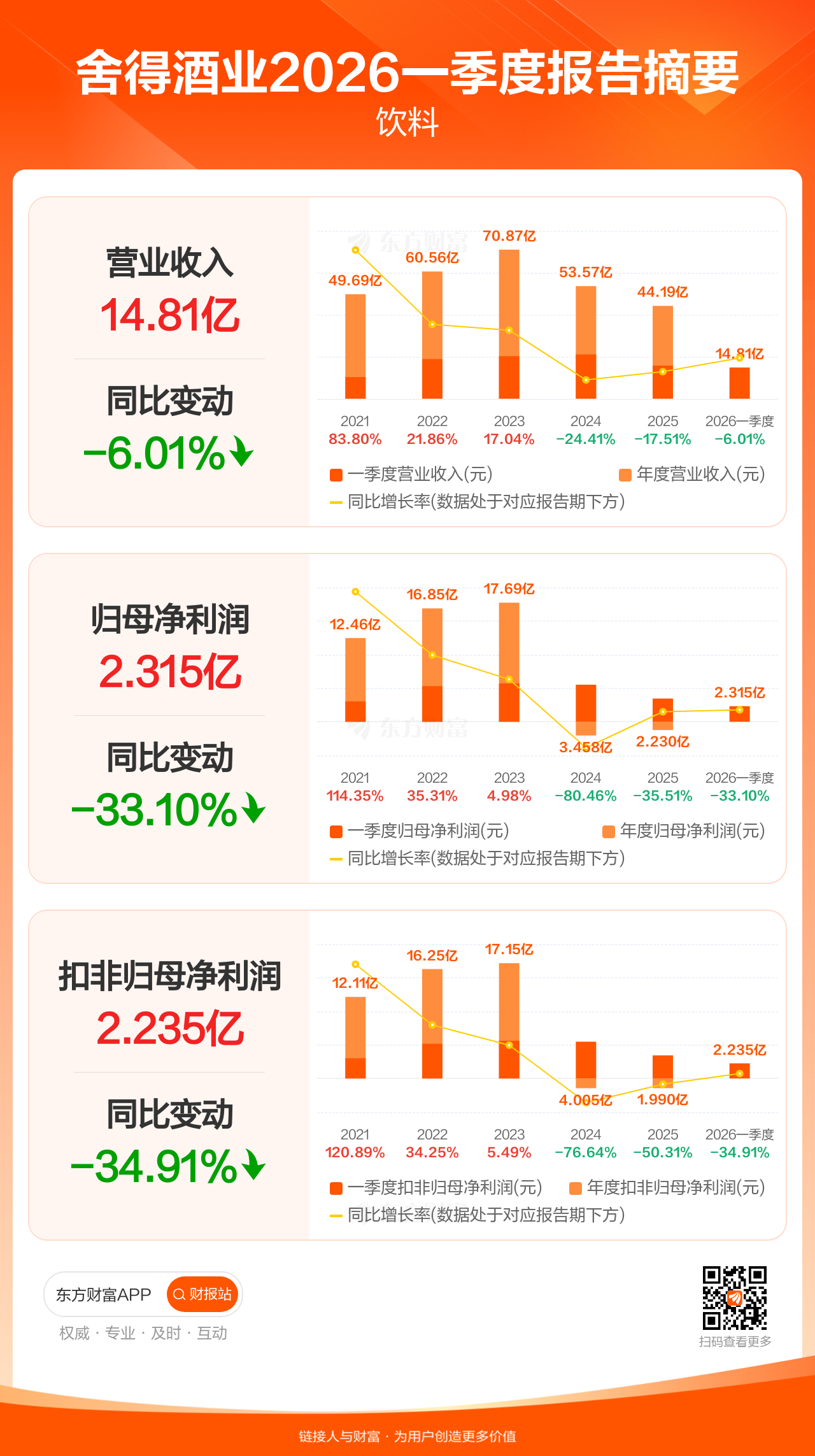 舍得酒业4月16日发布2026年一季报显示,公司一季度实现营业收入14.81亿元,同比下滑6.01%;归母净利润2.32亿元,同比下滑33.10%;扣非归母净利润2.23亿元,同比下滑34.91%。