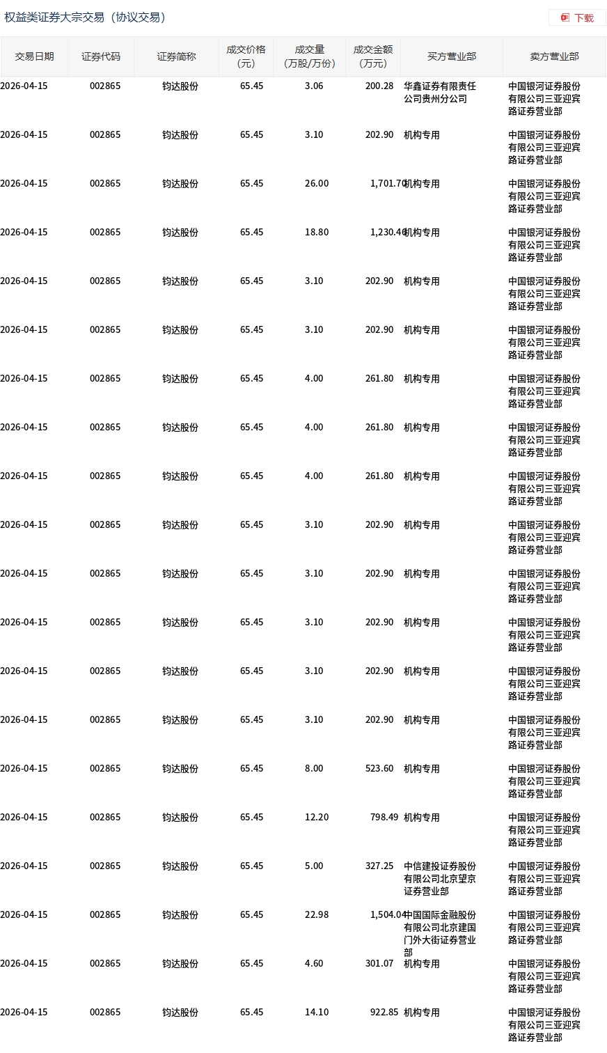 4月15日,钧达股份大宗交易成交168.71万股,成交额1.1亿元,占当日总成交额的5.08%,成交价65.45元,较市场收盘价72.96元折价10.29%。