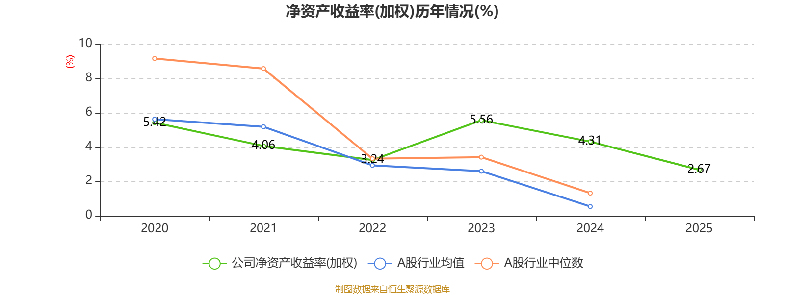数据显示,2025年公司平均净资产收益率为2.67%,较上年同期下降1.64个百分点。