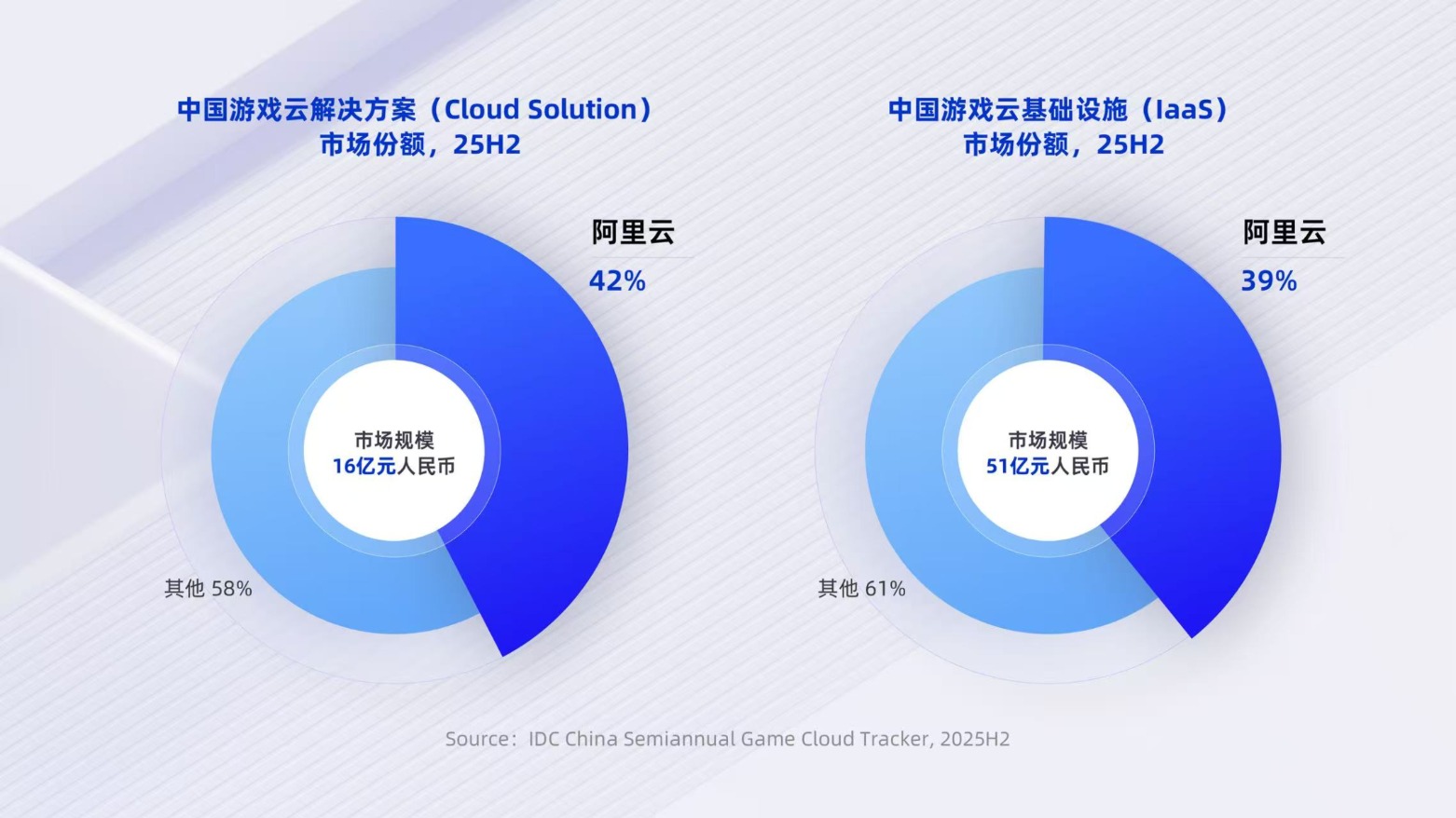 在市场格局方面,阿里云继续领跑。报告显示,2025年下半年,阿里云稳居中国游戏云市场份额首位,并带动其全年市场份额持续攀升,这也是阿里云连续第五年位列该市场第一。在游戏云解决方案与基础设施两大核心细分市场中,阿里云均排名第一,市场份额分别达到42%和39%。