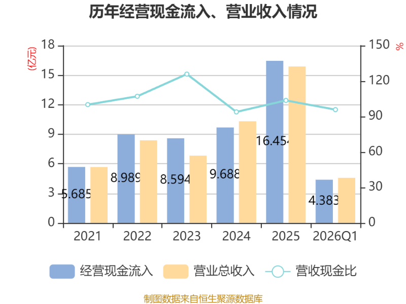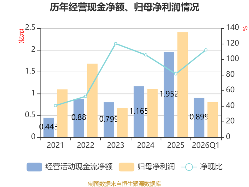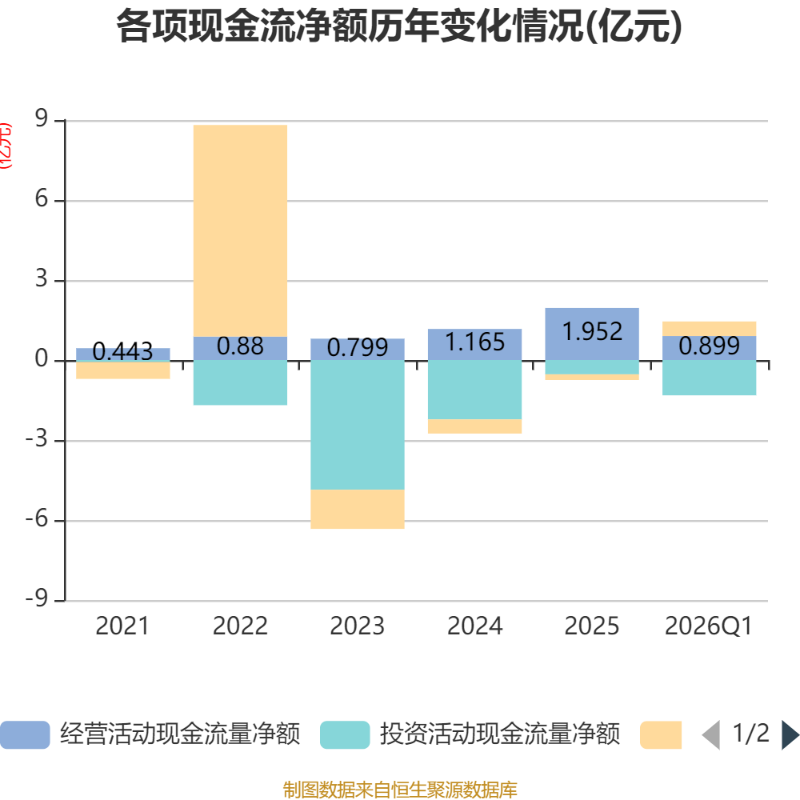 截至2026年一季度末,公司经营活动现金流净额为8993.11万元,同比增长945.54%;筹资活动现金流净额5458.98万元,同比增加1759.91万元;投资活动现金流净额-1.33亿元,上年同期为-91.54万元。