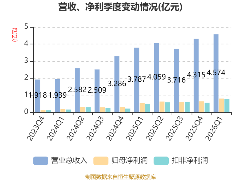 中证智能财讯鼎通科技(688668)4月16日披露2026年第一季度报告。公司实现营业总收入4.57亿元,同比增长20.78%;归母净利润8032.74万元,同比增长51.86%;扣非净利润7663.62万元,同比增长55.90%;经营活动产生的现金流量净额为8993.11万元,同比增长945.54%;报告期内,鼎通科技基本每股收益为0.58元,加权平均净资产收益率为3.88%。