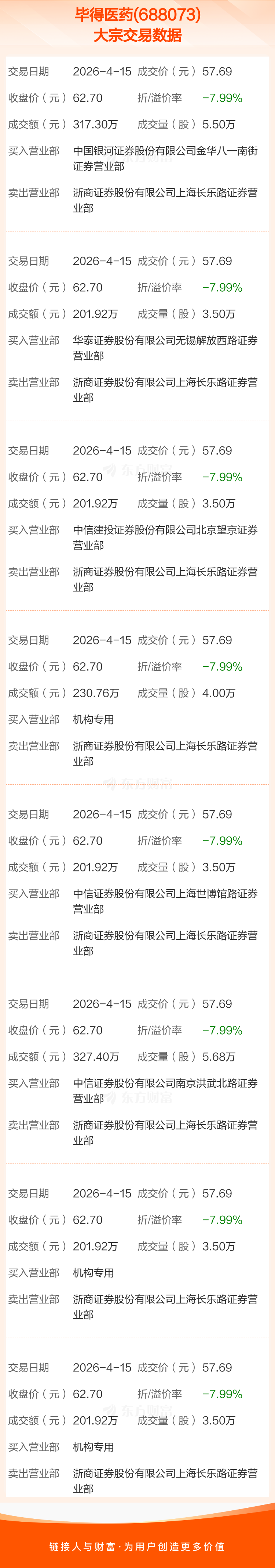 2026年4月15日,毕得医药发生8笔大宗交易,共成交32.68万股,成交金额1885.06万元,占其流通市值比例为0.33%。
