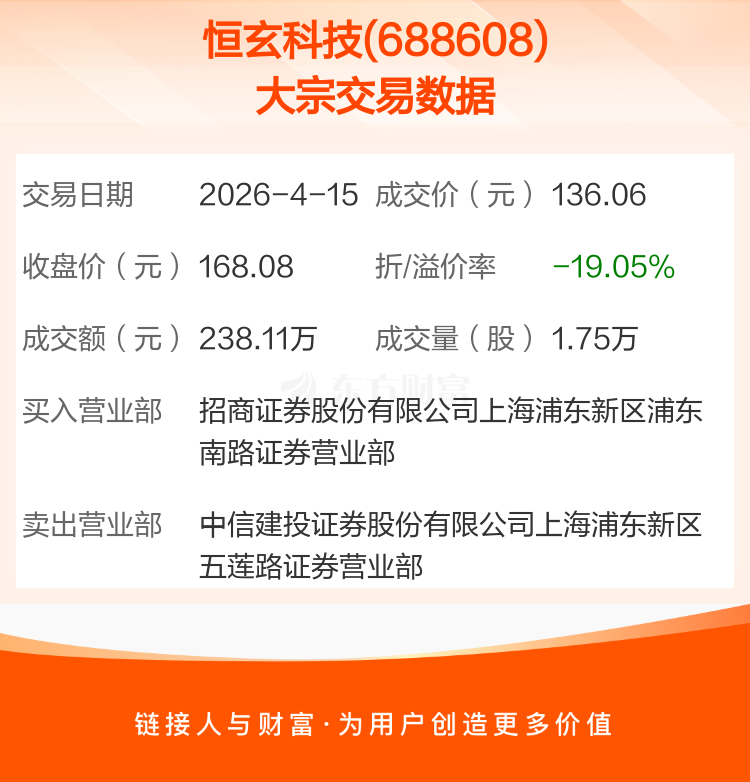 2026年4月15日,恒玄科技发生1笔大宗交易,共成交1.75万股,成交金额238.11万元。