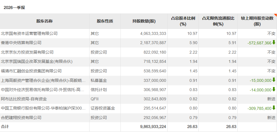 全球知名主权财富基金阿布扎比投资局今年一季度新进京东方A前十大流通股股东名单,截至一季度末,阿布扎比投资局持有京东方的数量为3亿股。