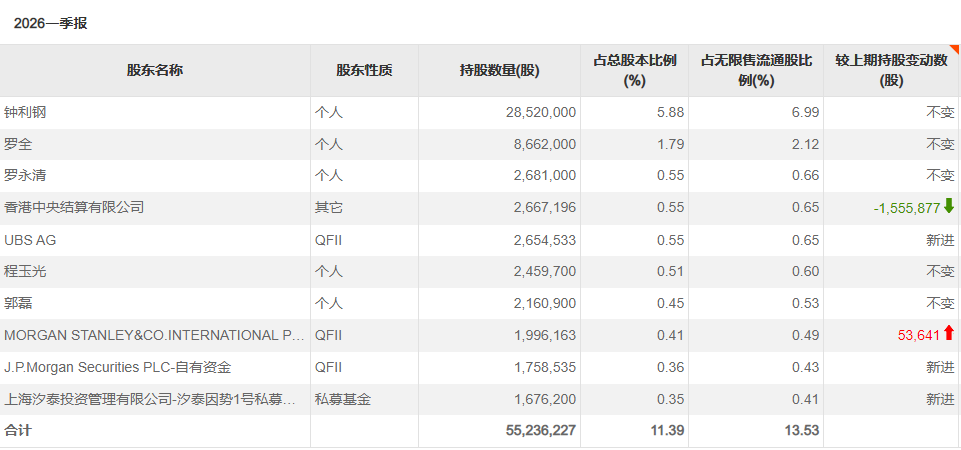 具体来看,今年一季度,瑞银集团和摩根大通两大外资巨头新进川润股份前十大流通股股东名单,截至一季度末,二者分别持股265.45万股、175.85万股。此外,摩根士丹利在一季度增持5.36万股川润股份,截至一季度末,该机构持股总数为199.62万股。