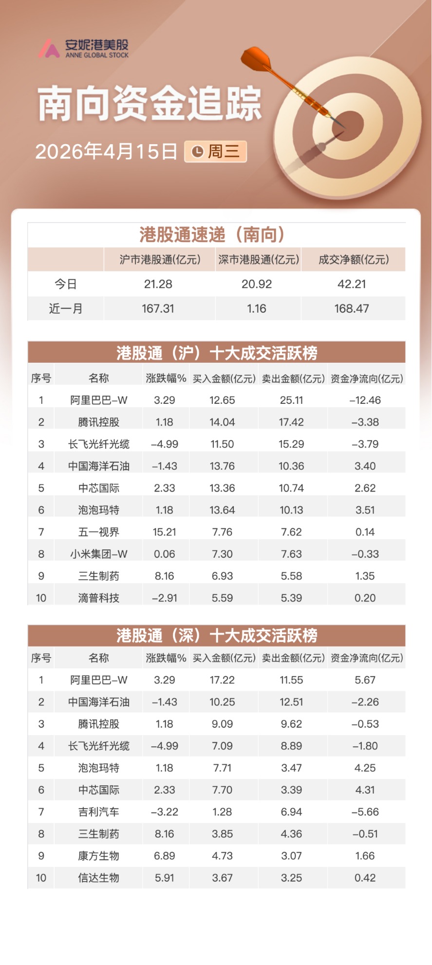 原标题:南向资金追踪|净买入超42亿港元 加仓泡泡玛特流出阿里及长飞光纤