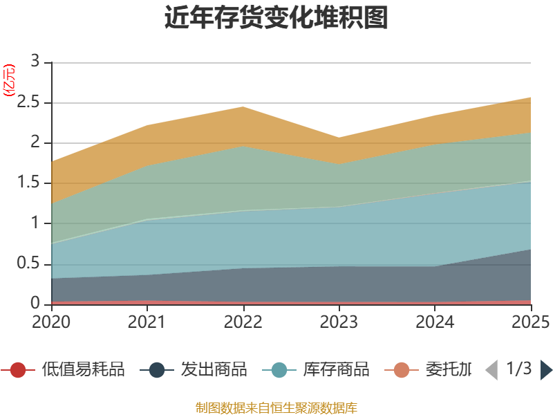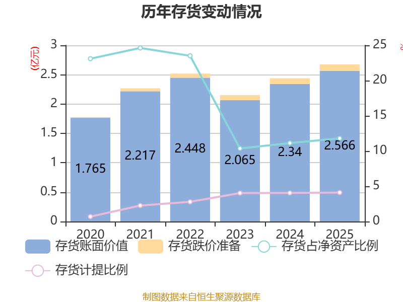 从存货变动来看,截至2025年末,公司存货账面价值为2.57亿元,占净资产的11.8%,较上年末增加2260.32万元。其中,存货跌价准备为1098.46万元,计提比例为4.1%。