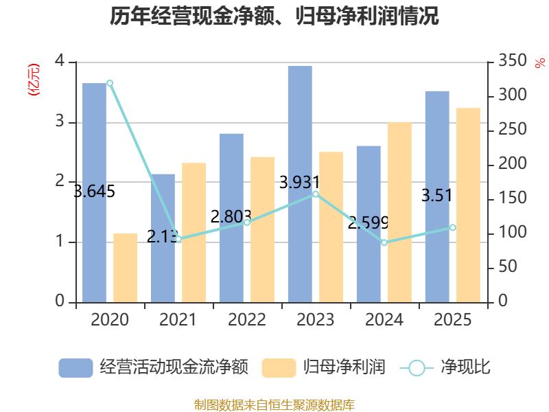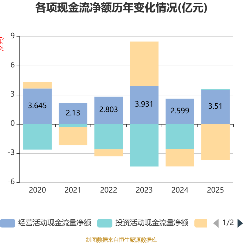 截至2025年,公司经营活动现金流净额为3.51亿元,同比增长35.03%;筹资活动现金流净额-3.7亿元,同比减少1.91亿元;投资活动现金流净额942.91万元,上年同期为-2.59亿元。