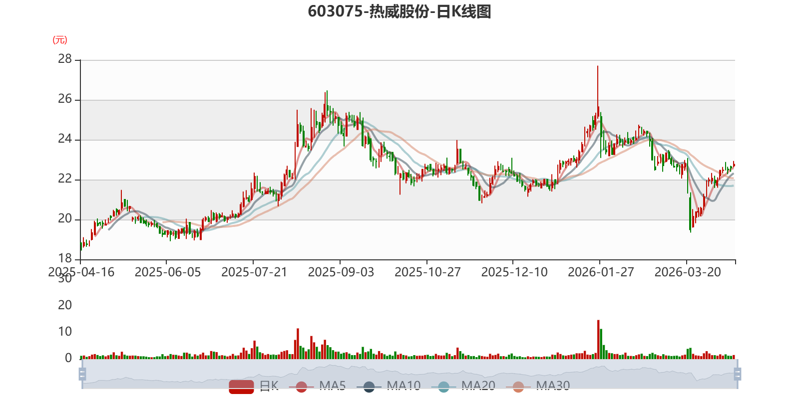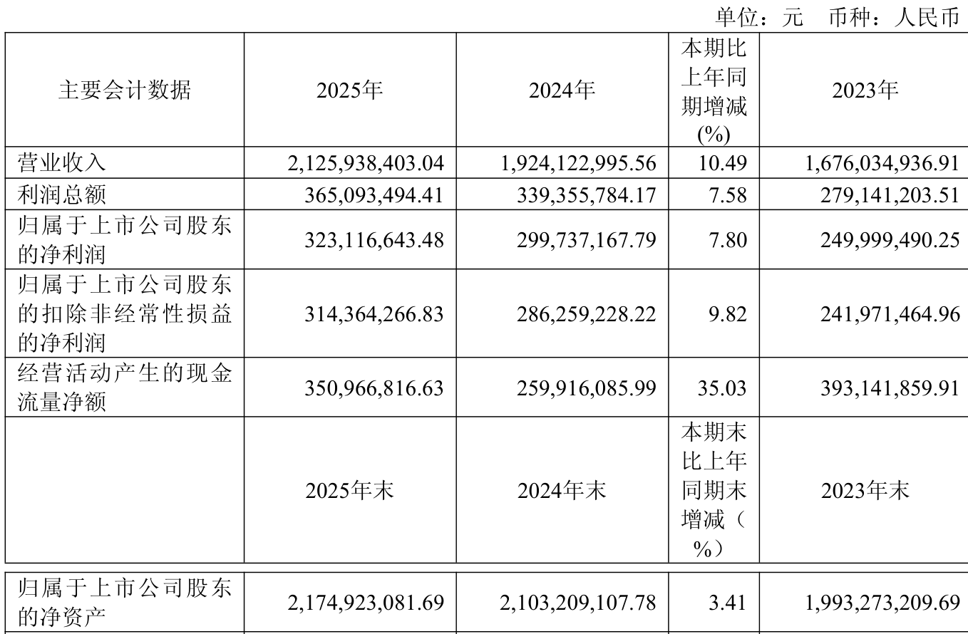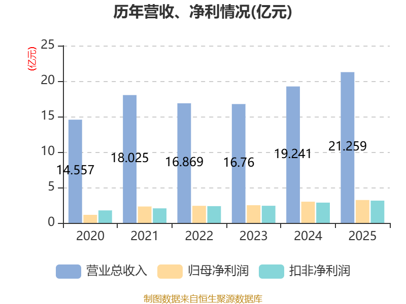 中证智能财讯热威股份(603075)4月16日披露2025年年度报告。2025年,公司实现营业总收入21.26亿元,同比增长10.49%;归母净利润3.23亿元,同比增长7.80%;扣非净利润3.14亿元,同比增长9.82%;经营活动产生的现金流量净额为3.51亿元,同比增长35.03%;报告期内,热威股份基本每股收益为0.81元,加权平均净资产收益率为15.33%。公司2025年度分配预案为:拟向全体股东每10股派现7元(含税)。