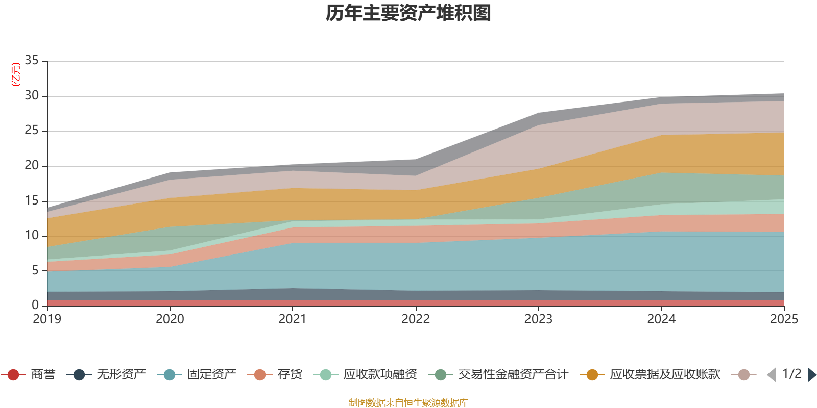 资产重大变化方面,截至2025年末,公司交易性金融资产合计较上年末减少25.3%,占公司总资产比重下降4.04个百分点;应收票据及应收账款较上年末增加14.97%,占公司总资产比重上升2.33个百分点;应收款项融资较上年末增加35.99%,占公司总资产比重上升1.74个百分点;存货较上年末增加9.66%,占公司总资产比重上升0.61个百分点。