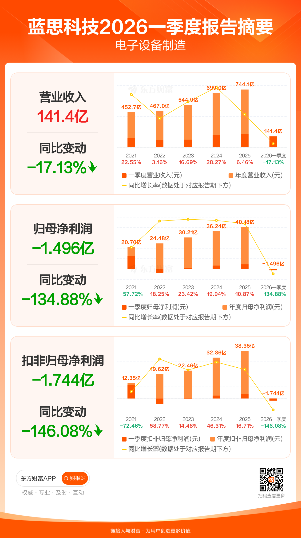 蓝思科技4月16日发布2026年一季报显示,公司一季度实现营业收入141.40亿元,同比下滑17.13%;归母净利润-1.50亿元;扣非归母净利润-1.74亿元。