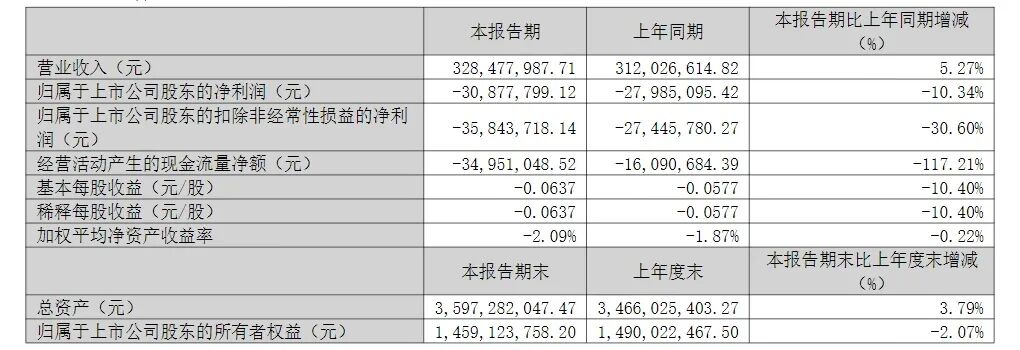 一季报显示,公司实现营业收入3.28亿元,同比增长5.27%;实现归属于上市公司股东的净利润亏损3087.77万元,亏损额同比增加10.34%。