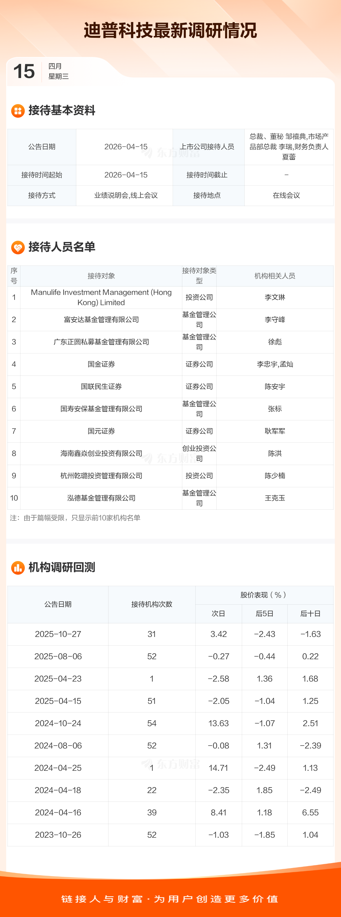 迪普科技4月15日公告称,4月15日接待Manulife Investment Management (Hong Kong) Limited等43家机构调研。接待人员包括总裁、董秘 邹禧典,市场产品部总裁 李瑞,财务负责人 夏蕾。