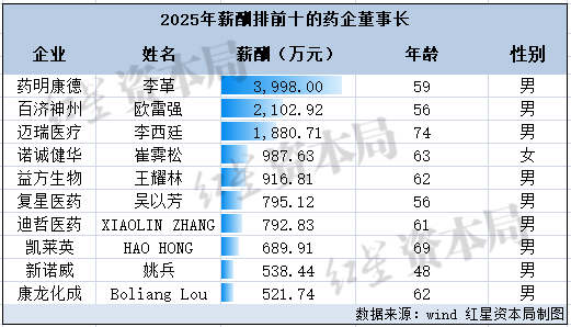 红星资本局注意到,2024年开始,A股管理层薪酬榜前三名就被医药企业董事长包揽,2025年也不例外,另外两名分别是百济神州-U(688235.SH;6160.HK)董事长欧雷强、迈瑞医疗(300760.SZ)董事长李西廷,年薪依次是2102.92万元、1880.71万元。
