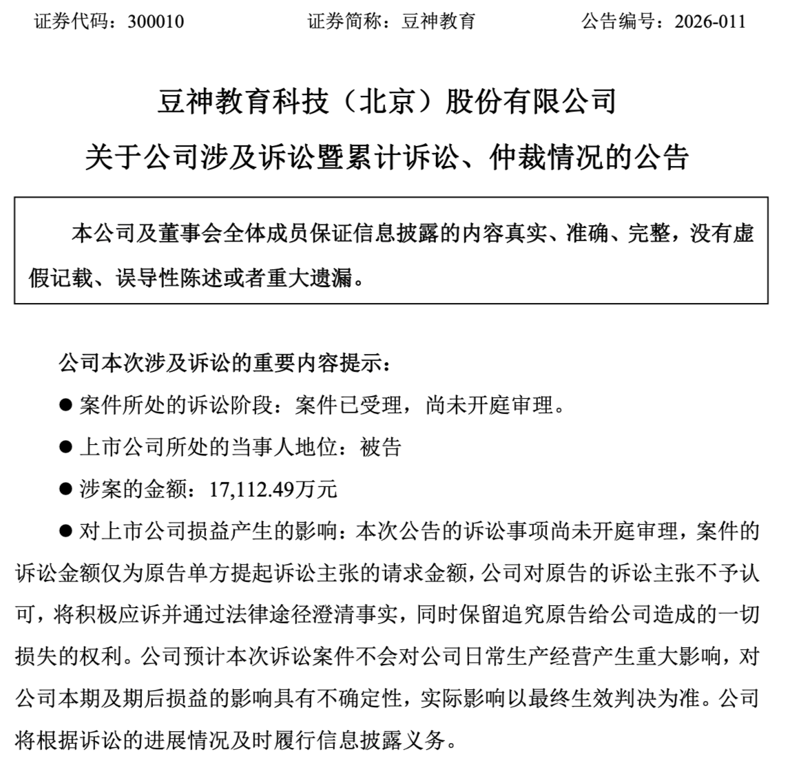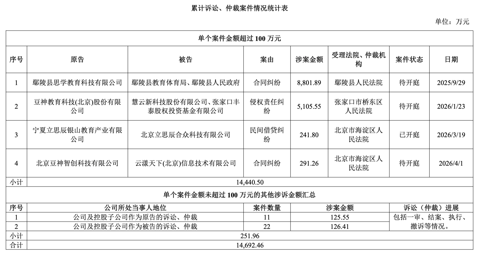 据悉,截至公告披露日,豆神教育及控股子公司新增发生且未披露的诉讼、仲裁事项涉及金额1.47亿元,占公司2024年度经审计的归属于上市公司股东净资产的9.06%。