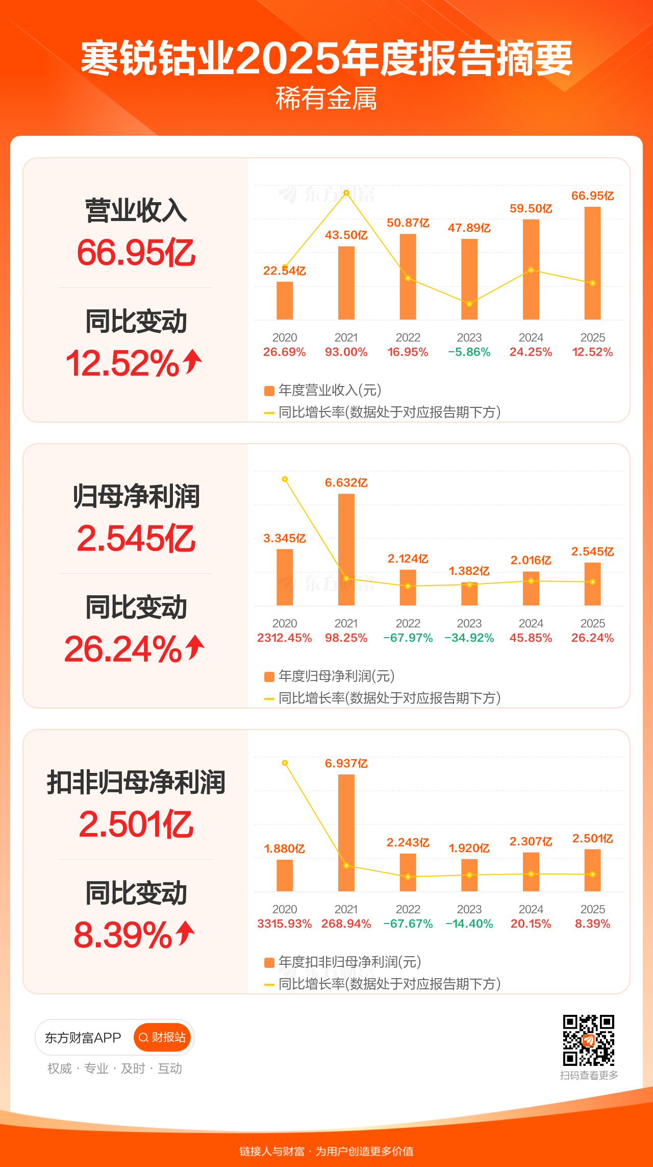 寒锐钴业4月16日发布2025年年报显示,公司全年实现营业收入66.95亿元,同比增长12.52%;归母净利润2.55亿元,同比增长26.24%;扣非归母净利润2.50亿元,同比增长8.39%。