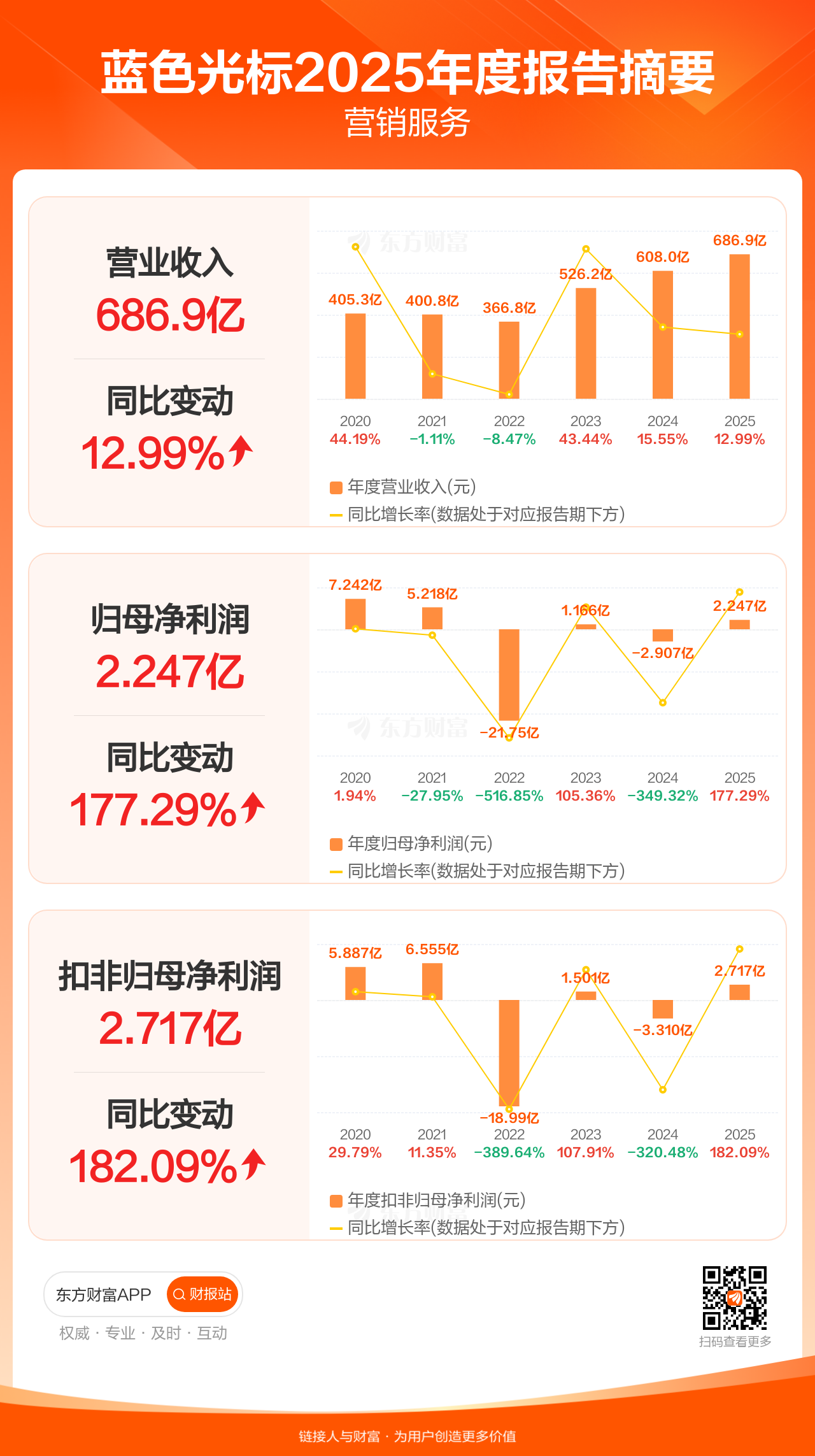 蓝色光标4月16日发布2025年年报显示,公司全年实现营业收入686.93亿元,同比增长12.99%;归母净利润2.25亿元,同比增长177.29%;扣非归母净利润2.72亿元,同比增长182.09%。