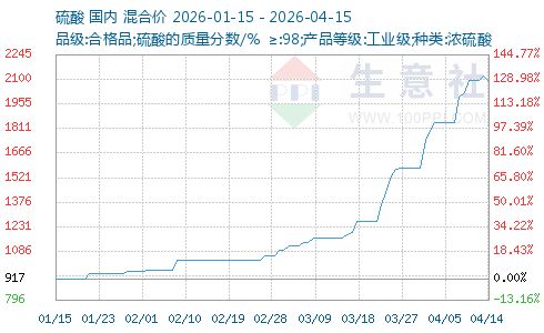 据了解,本次硫酸价格上行,主要受美伊冲突等地缘局势因素影响,作为核心原料的硫磺进口受阻,导致价格持续高位运行,带动硫酸价格从年初的约917元/吨一路攀升至4月中旬的2100元/吨,涨幅近130%。