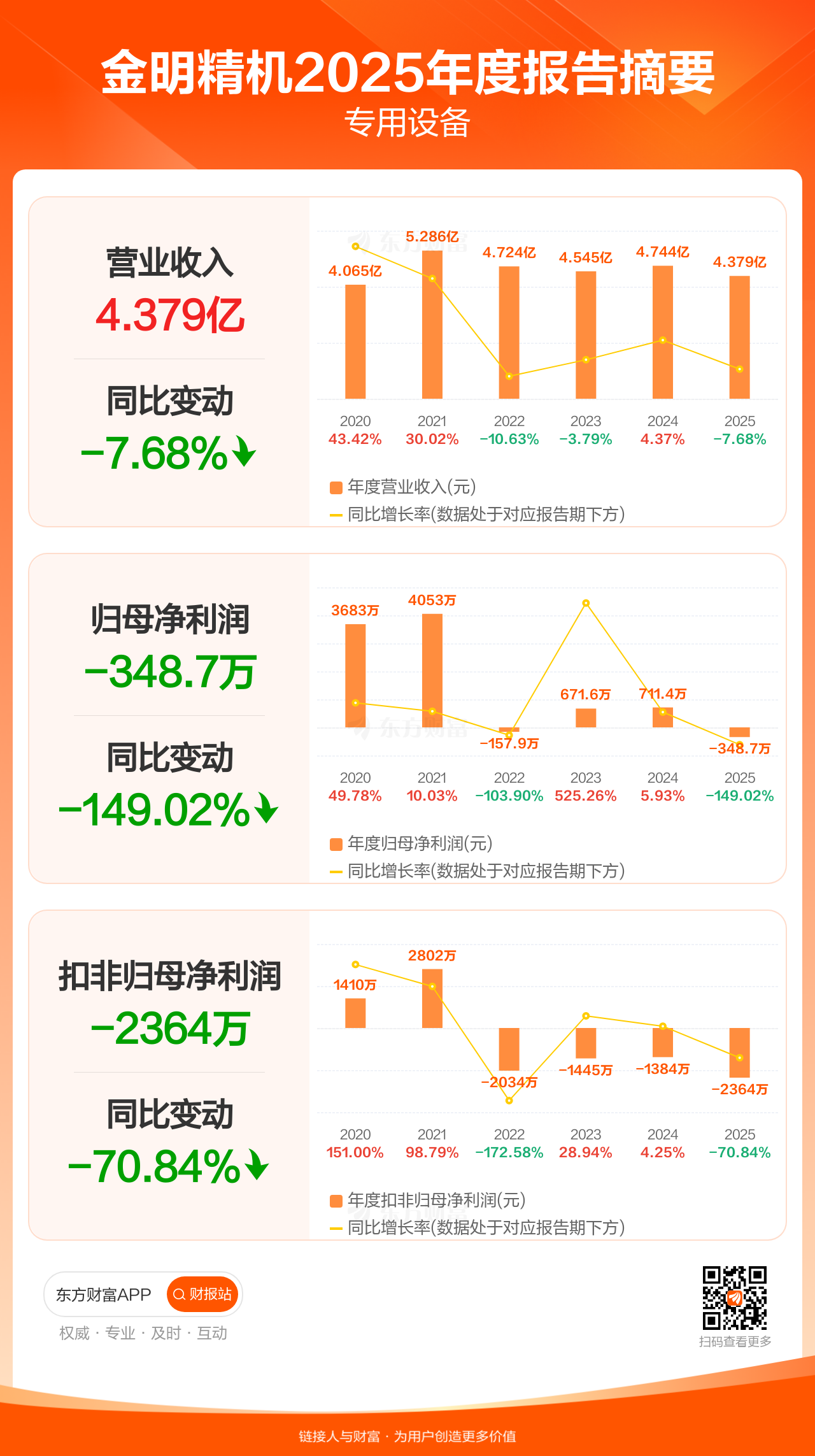 金明精机4月16日发布2025年年报显示,公司全年实现营业收入4.38亿元,同比下滑7.68%;归母净利润-348.71万元;扣非归母净利润-2364.23万元。