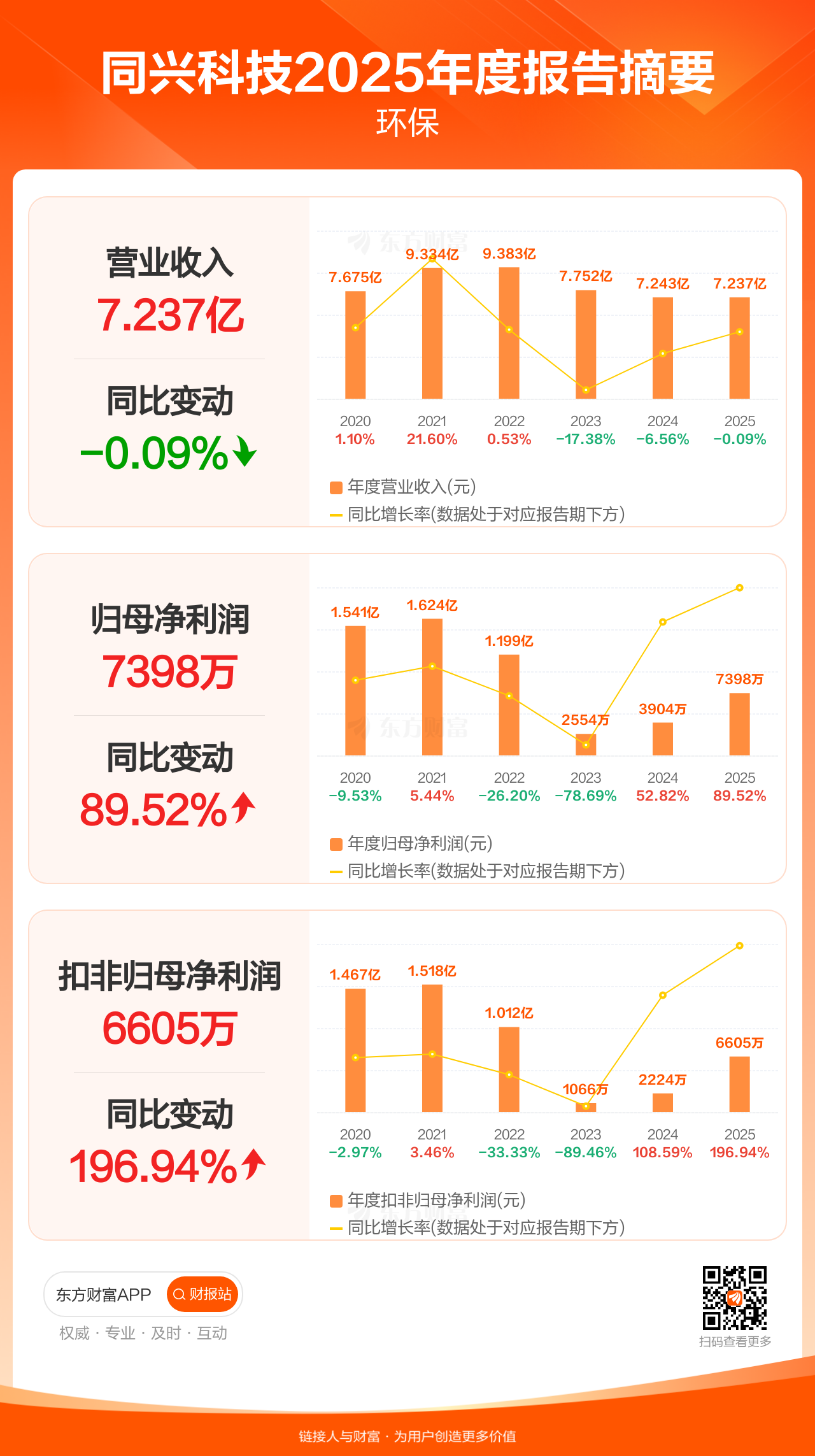 同兴科技4月16日发布2025年年报显示,公司全年实现营业收入7.24亿元,同比下滑0.09%;归母净利润7397.94万元,同比增长89.52%;扣非归母净利润6604.66万元,同比增长196.94%。