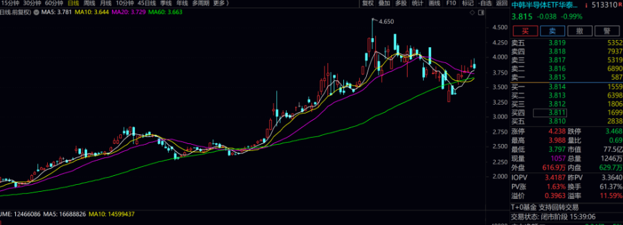另外场内ETF还有折溢价的情况,再拿中韩半导体ETF为例,目前净值约为3.42元,而场内价格为3.815元,溢价率为11.59%。
