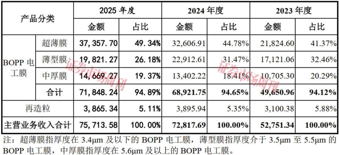 BOPP电工膜根据不同厚度可以分为超薄膜、薄型膜和中厚膜三种类型,而超薄膜是嘉德利最重要的细分品类,主要应用于新能源汽车用薄膜电容器。报告期内此类产品贡献的收入分别为21824.60万元、32606.91万元和37357.70万元,占主营业务收入的比例分别为41.37%、44.78%和49.34%,收入规模和相关占比均呈增长态势。