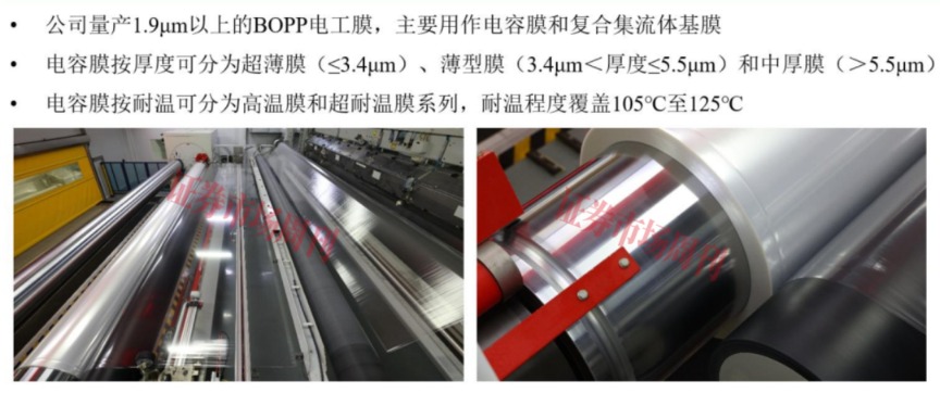 BOPP电工膜是由聚丙烯树脂经过双向拉伸工艺制成的一种绝缘介质材料,具有自愈性好、耐压高、厚薄均匀性好、介质损耗小、比重低等特点,下游应用领域包括薄膜电容器用聚丙烯薄膜(电容膜)和复合铜箔基膜。在薄膜电容器中,BOPP电工膜起到使被间隔的两端电极积蓄电荷的作用,其性能直接影响电容器容值大小、稳定性和使用寿命等核心指标。在锂电池复合集流体中,BOPP电工膜可以作为负极复合铜箔基膜,能有效提高电池安全性并降低成本。