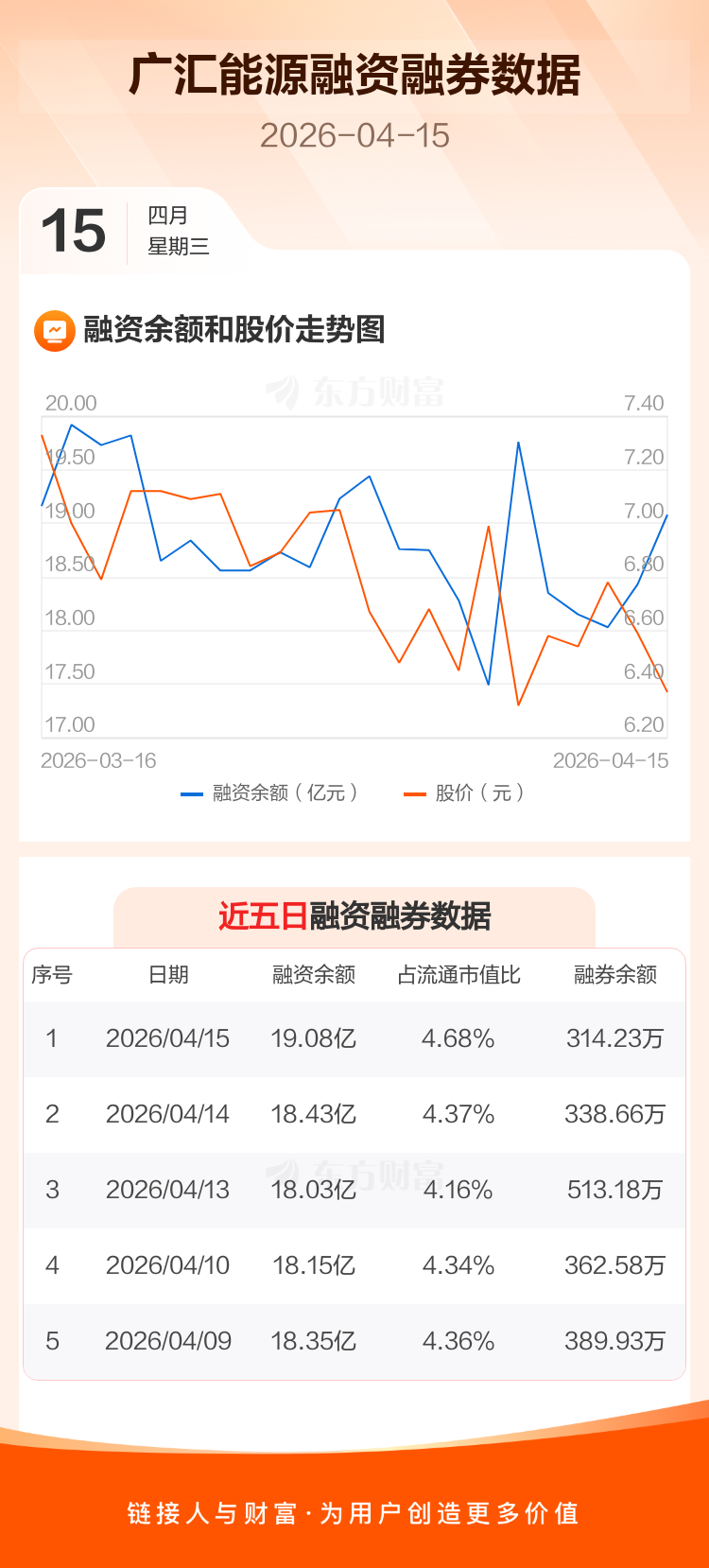 交易所最新数据显示,广汇能源于2026年4月15日获融资买入1.72亿元,融资偿还1.07亿元,当日融资净买入6464.86万元。目前,该股融资余额19.08亿,占流通市值比例为4.68%。