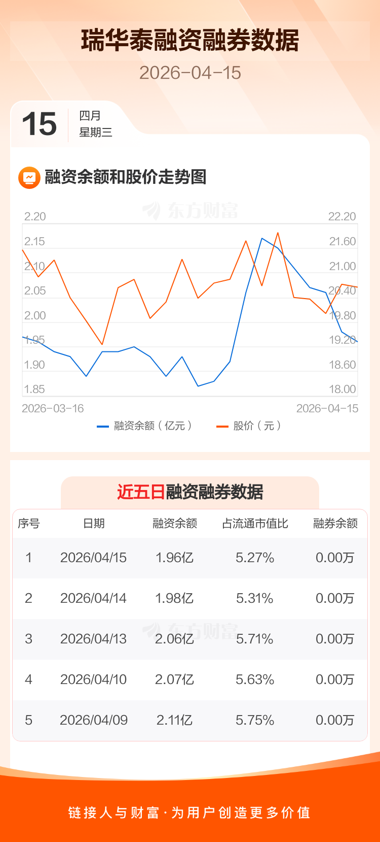 交易所最新数据显示,瑞华泰于2026年4月15日获融资买入1156.23万元,融资偿还1363.70万元,当日融资净偿还207.47万元。目前,该股融资余额1.96亿,占流通市值比例为5.27%。