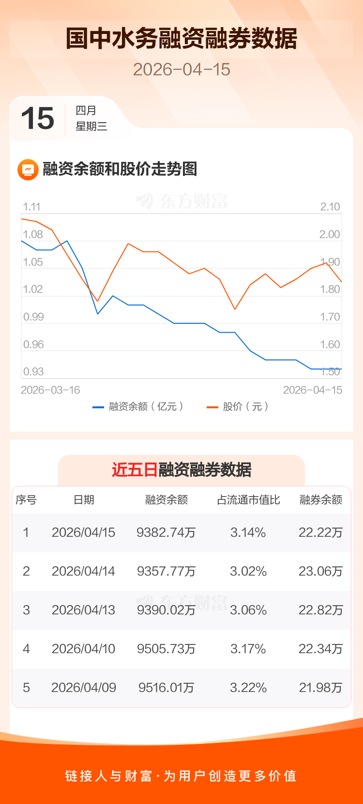 交易所最新数据显示,国中水务于2026年4月15日获融资买入126.23万元,融资偿还101.26万元,当日融资净买入24.97万元。目前,该股融资余额9382.74万,占流通市值比例为3.14%。