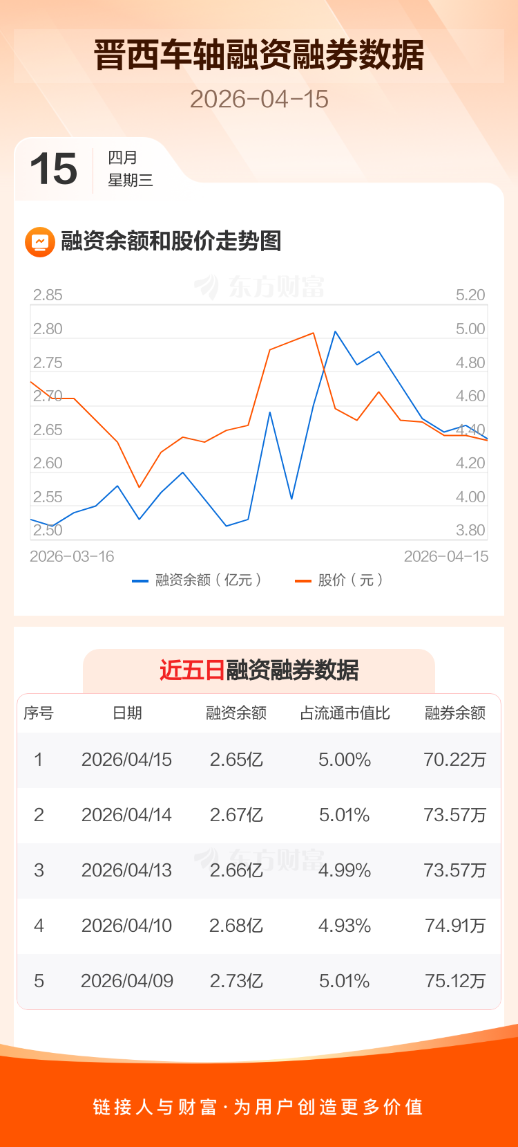 交易所最新数据显示,晋西车轴于2026年4月15日获融资买入745.58万元,融资偿还969.29万元,当日融资净偿还223.71万元。目前,该股融资余额2.65亿,占流通市值比例为5.00%。