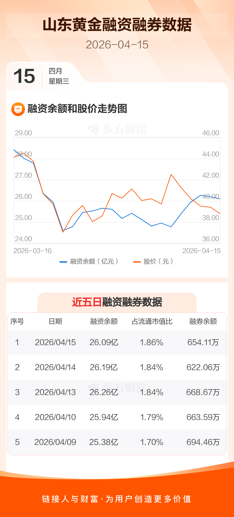 交易所最新数据显示,山东黄金于2026年4月15日获融资买入1.53亿元,融资偿还1.64亿元,当日融资净偿还1049.87万元。目前,该股融资余额26.09亿,占流通市值比例为1.86%。