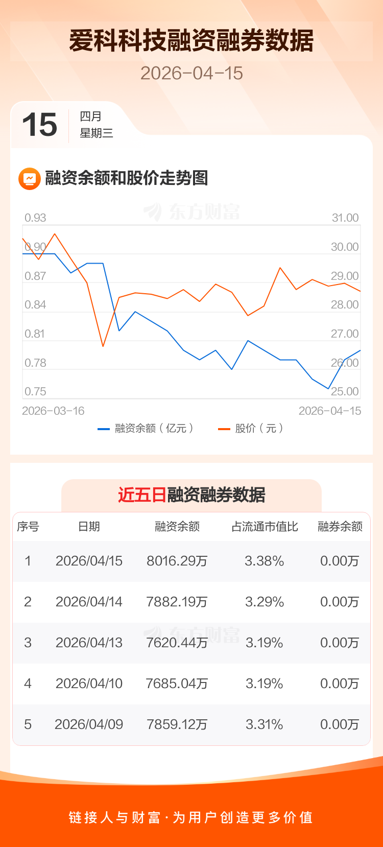 交易所最新数据显示,爱科科技于2026年4月15日获融资买入408.71万元,融资偿还274.61万元,当日融资净买入134.11万元。目前,该股融资余额8016.29万,占流通市值比例为3.38%。