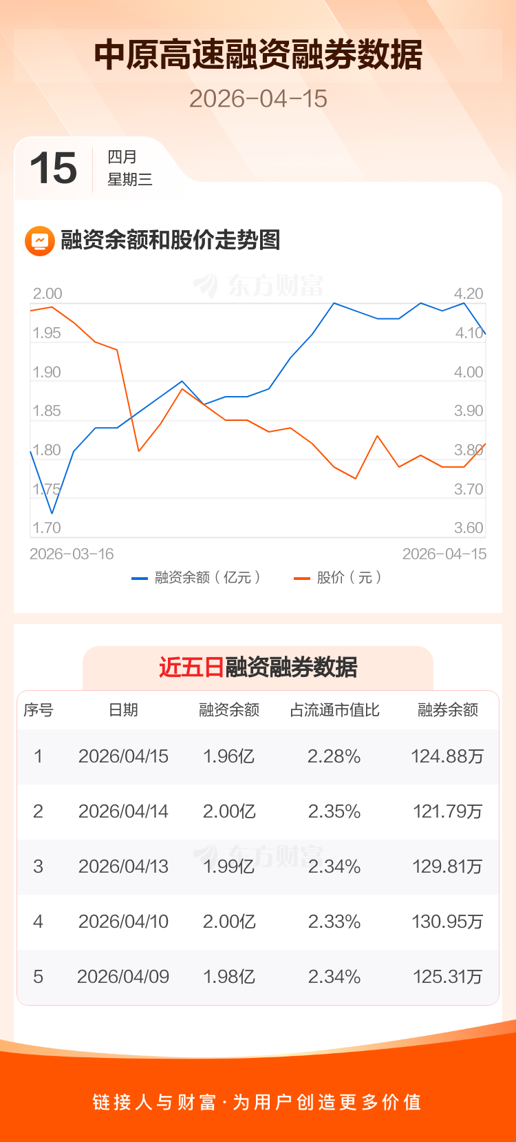 交易所最新数据显示,中原高速于2026年4月15日获融资买入789.52万元,融资偿还1133.82万元,当日融资净偿还344.29万元。目前,该股融资余额1.96亿,占流通市值比例为2.28%。