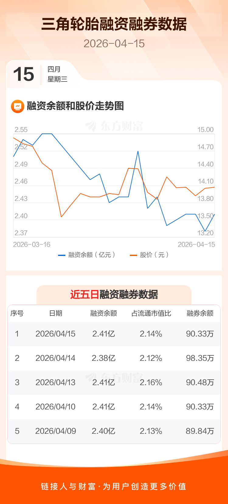 交易所最新数据显示,三角轮胎于2026年4月15日获融资买入597.44万元,融资偿还340.17万元,当日融资净买入257.27万元。目前,该股融资余额2.41亿,占流通市值比例为2.14%。